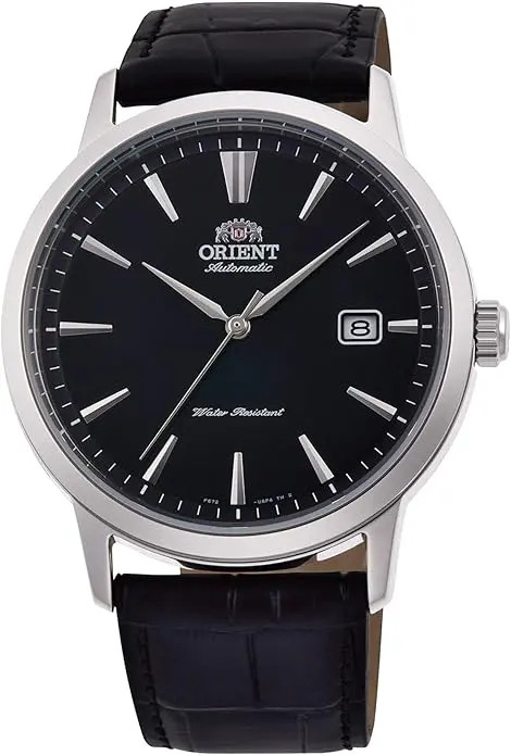 Az Orient RA-AC0F05B automata férfi karóra 41,6 mm acél tokban, fekete számlappal és bőrszíjjal – klasszikus elegancia, megbízható mechanika.