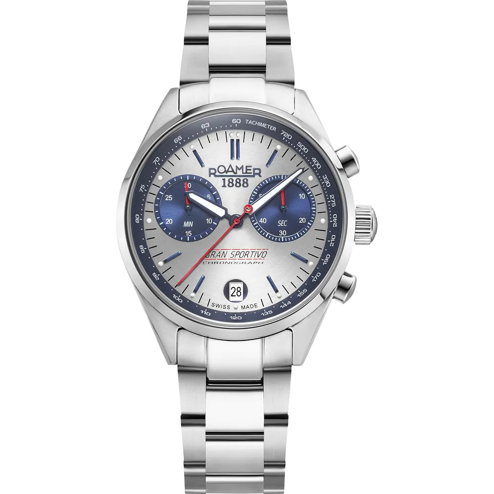 A Roamer Gran Sportivo 978818 41 45 21 férfi karóra egy svájci kronográf modell, amely a sportosságot és az eleganciát ötvözi. A 41,5 mm-es rozsdamentes acél tok és az ezüst-kék sunray számlap modern, mégis időtálló stílust képvisel.