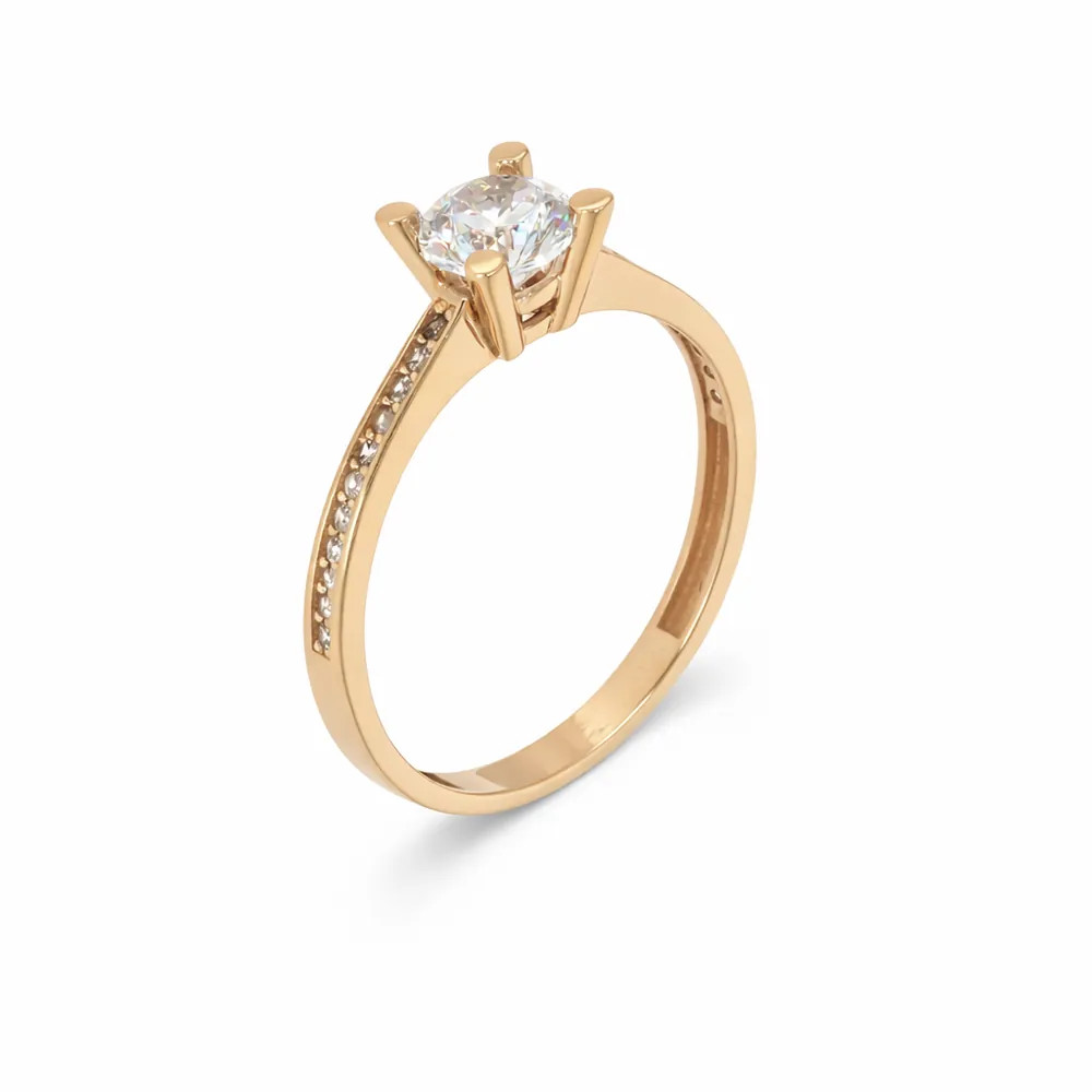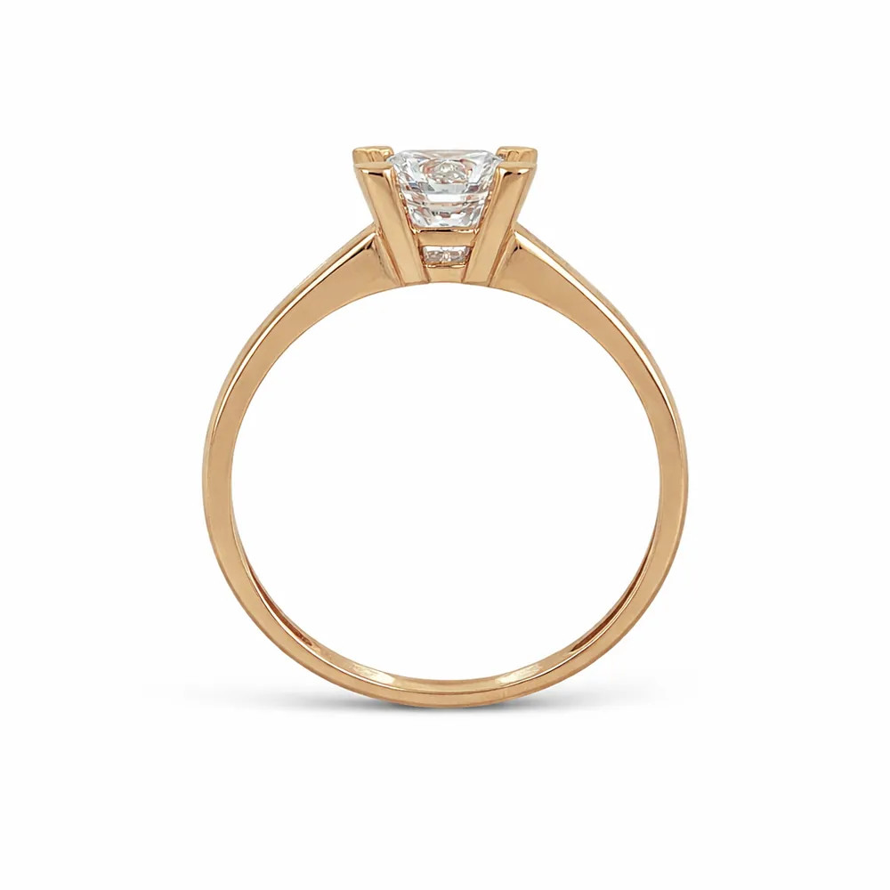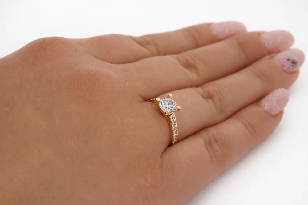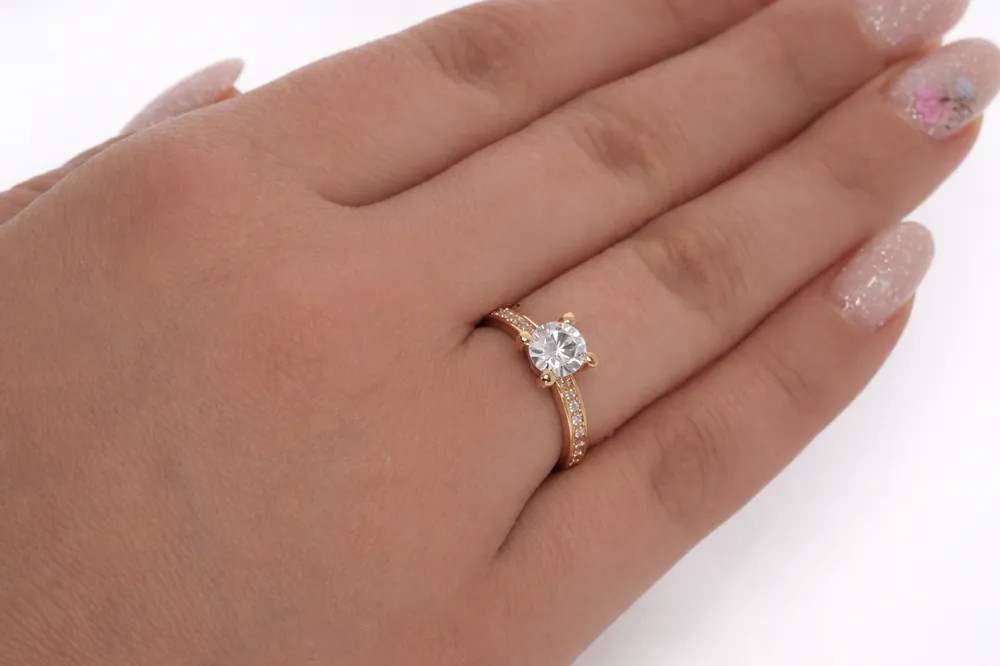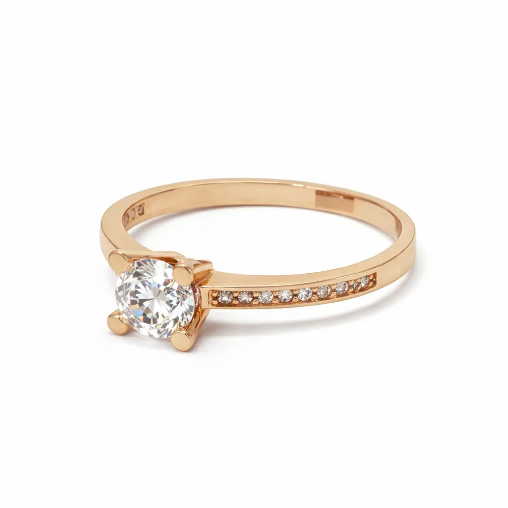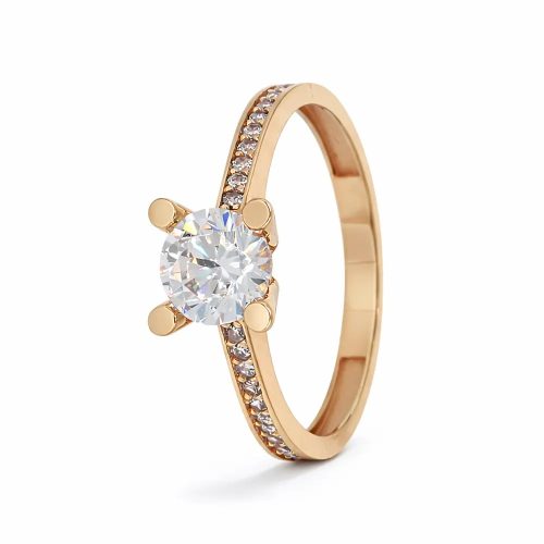 Ragyogó eljegyzési gyűrű briliáns hatású központi cirkon kővel és finoman csillogó sorköves díszítéssel. A 14 karátos rozéarany elegáns megjelenést ad, amely tökéletes választás különleges pillanatokhoz.