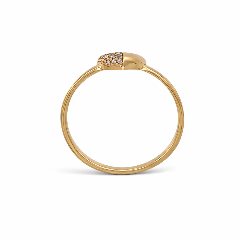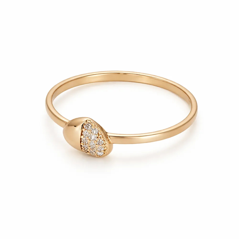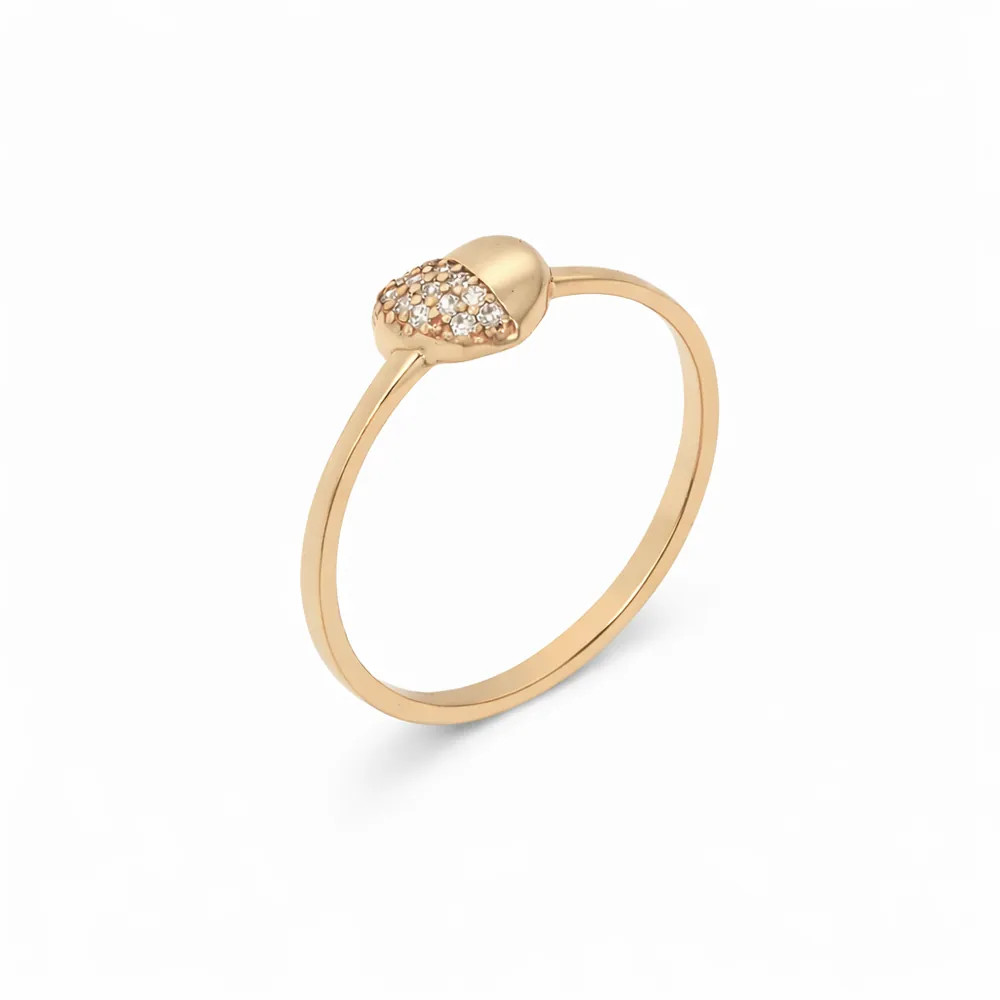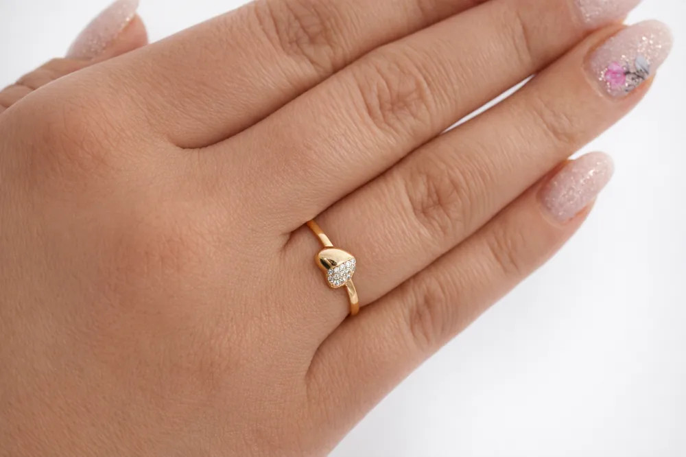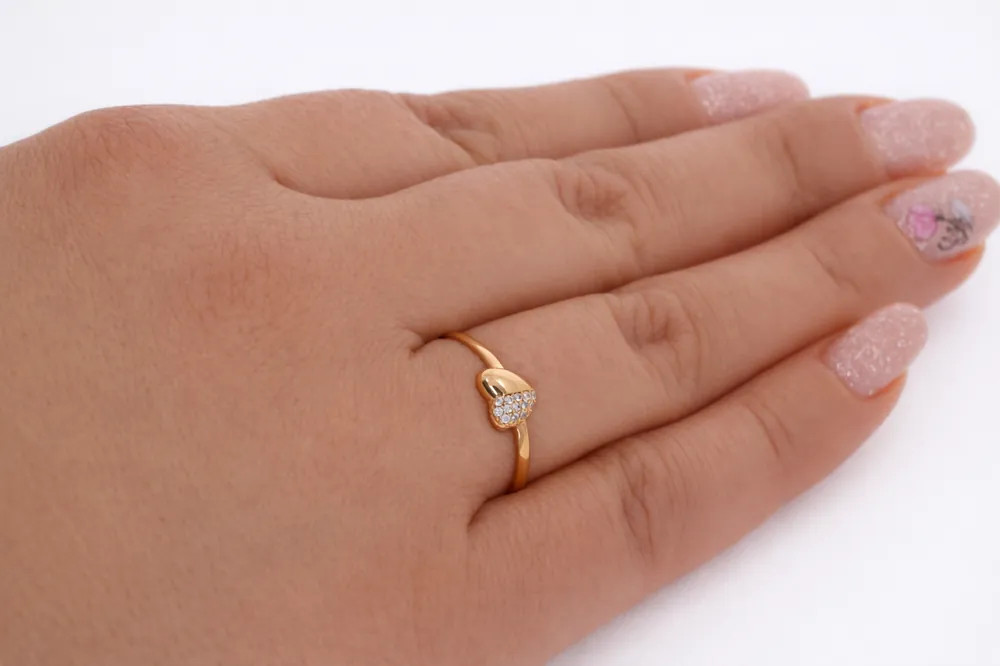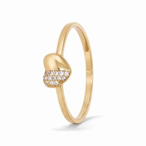 Romantikus szív alakú gyűrű finoman csillogó cirkon kövekkel díszítve. A 14 karátos rozéarany és a modern forma fiatalos, elegáns megjelenést ad, amely ideális ajándék különleges pillanatokhoz.
