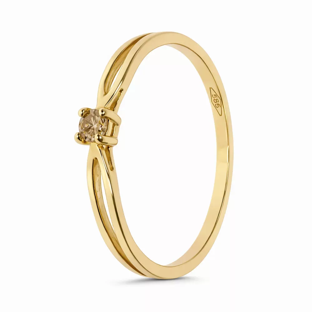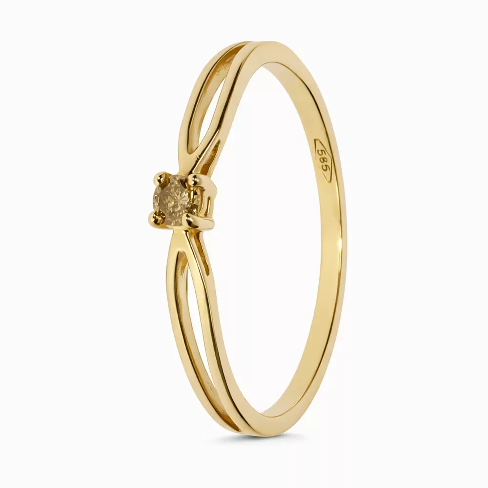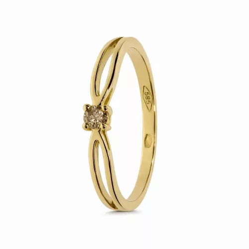 Különleges eljegyzési gyűrű champagne árnyalatú gyémánt kővel és elegáns sárga arany kialakítással. A finom vonalvezetés és a ragyogó központi kő időtálló eleganciát sugároz.