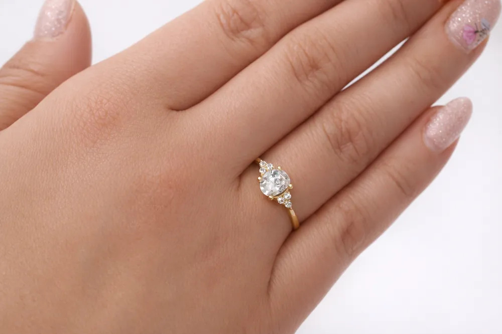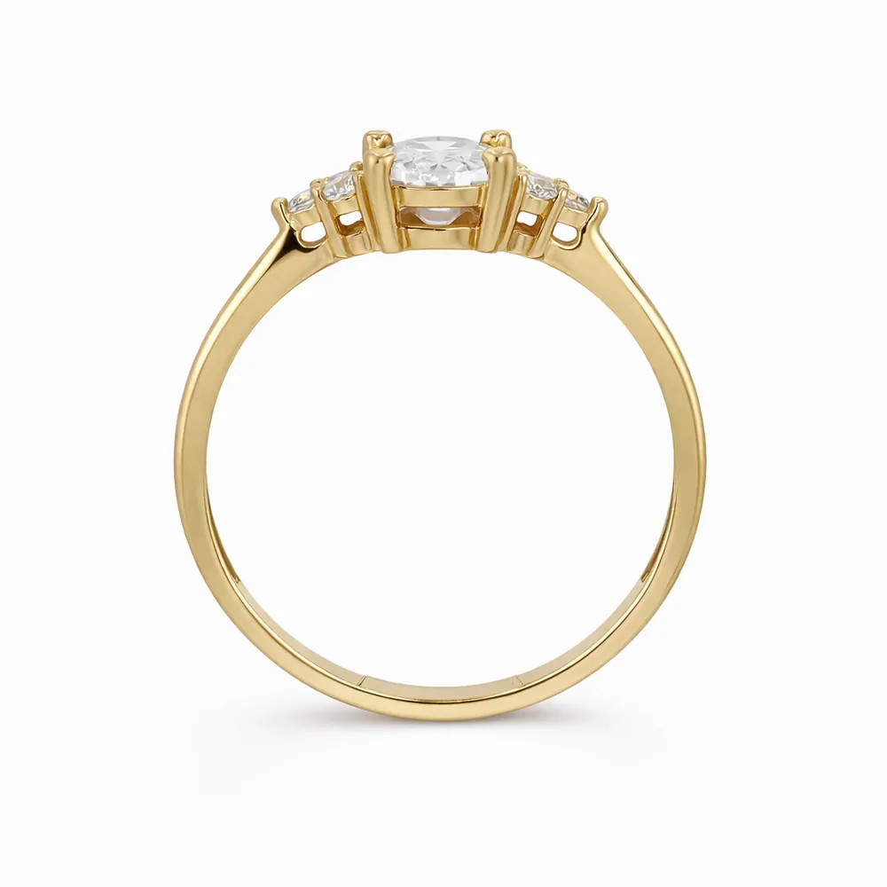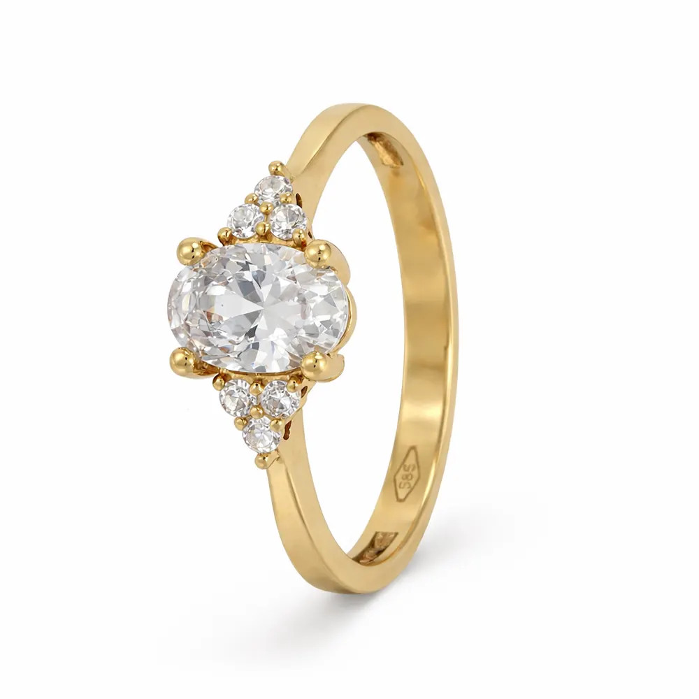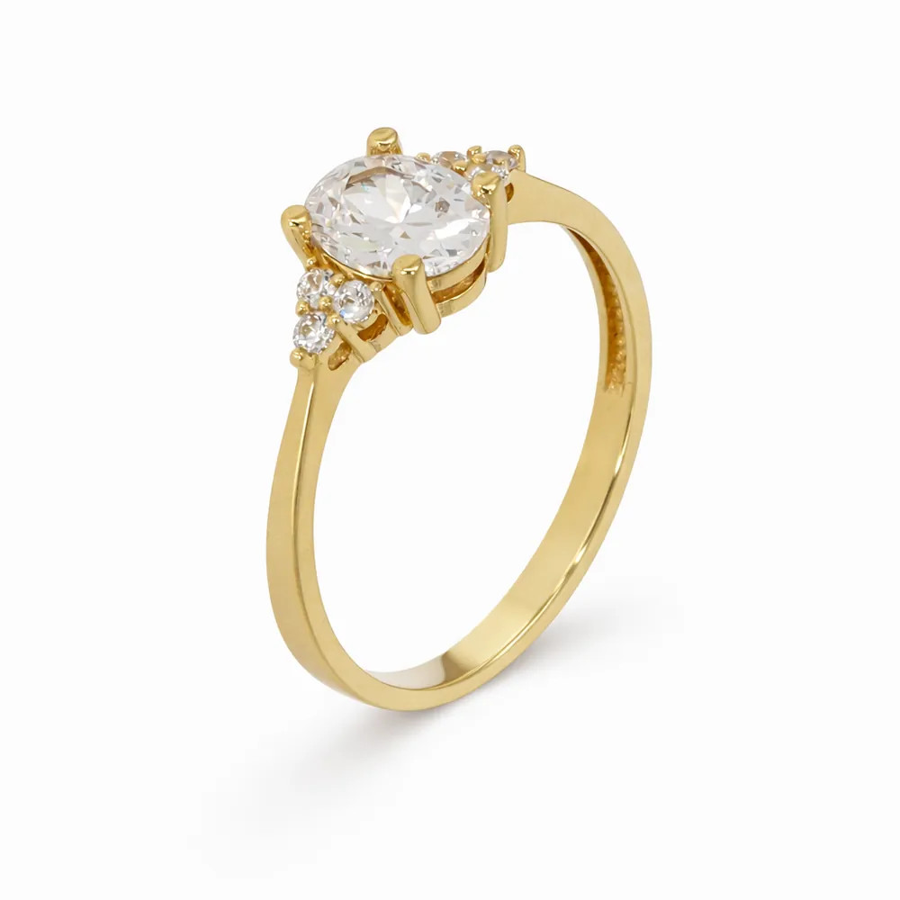 Romantikus ragyogás ovális központi kővel. A sárga arany és az oldalsó cirkon díszítés kifinomult megjelenést és időtálló eleganciát biztosít eljegyzési alkalmakra.
