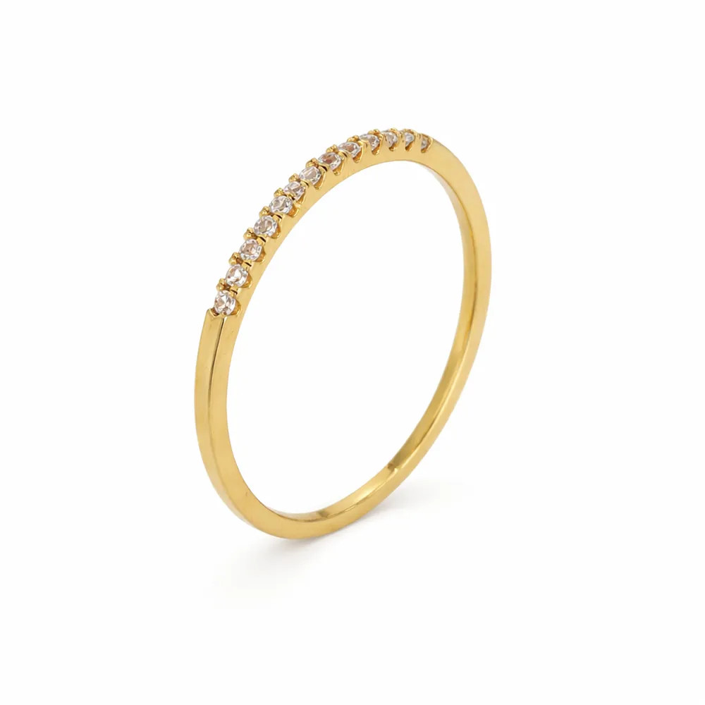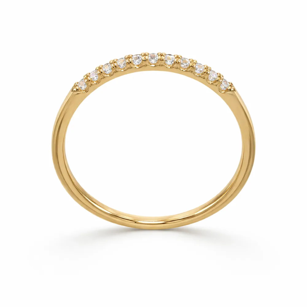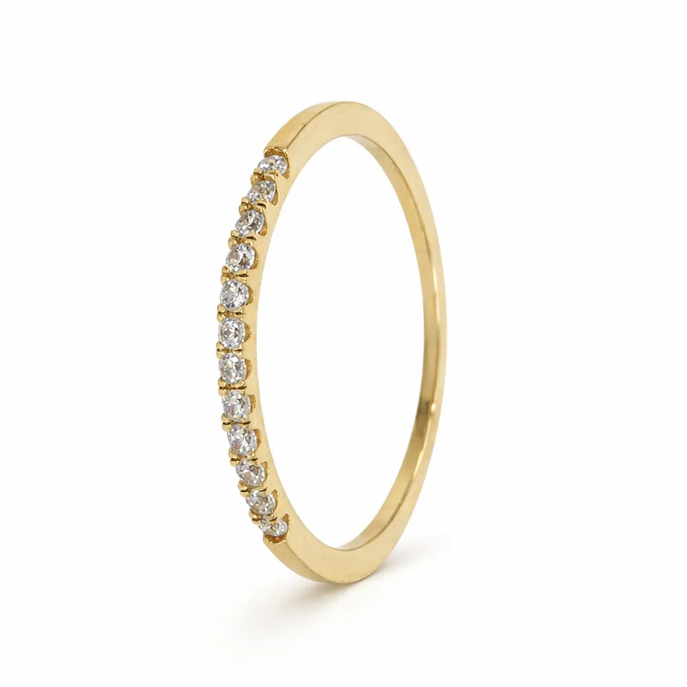 Finoman csillogó sorköves arany gyűrű. A vékony kialakítás és a ragyogó cirkon kövek fiatalos, kifinomult megjelenést biztosítanak mindennapi viselethez vagy ajándéknak.