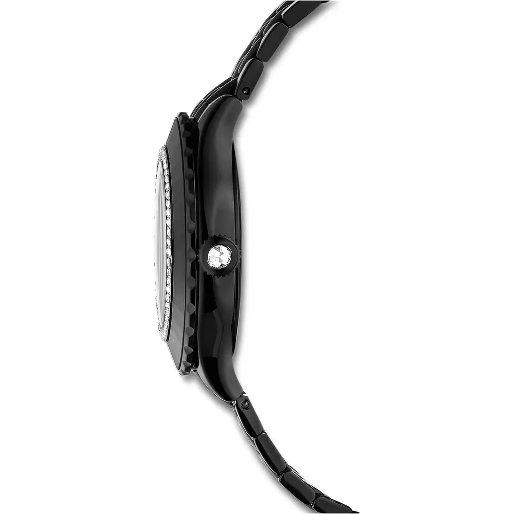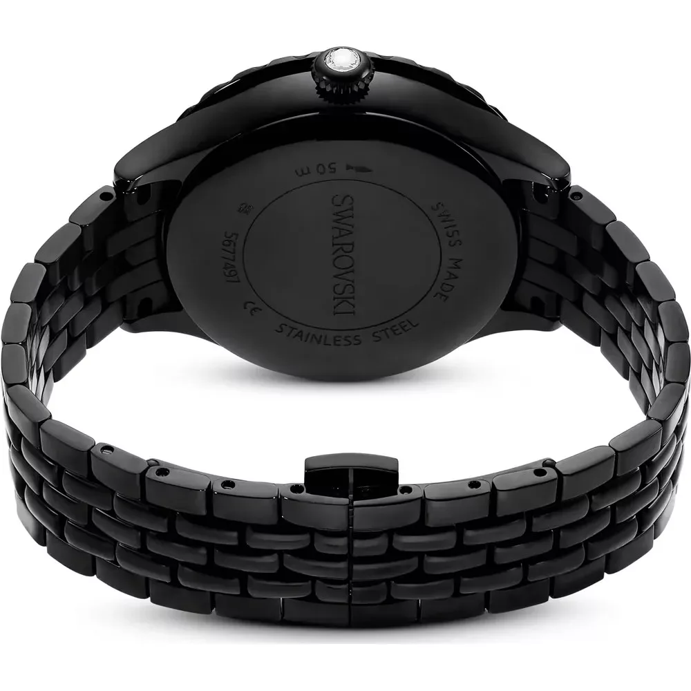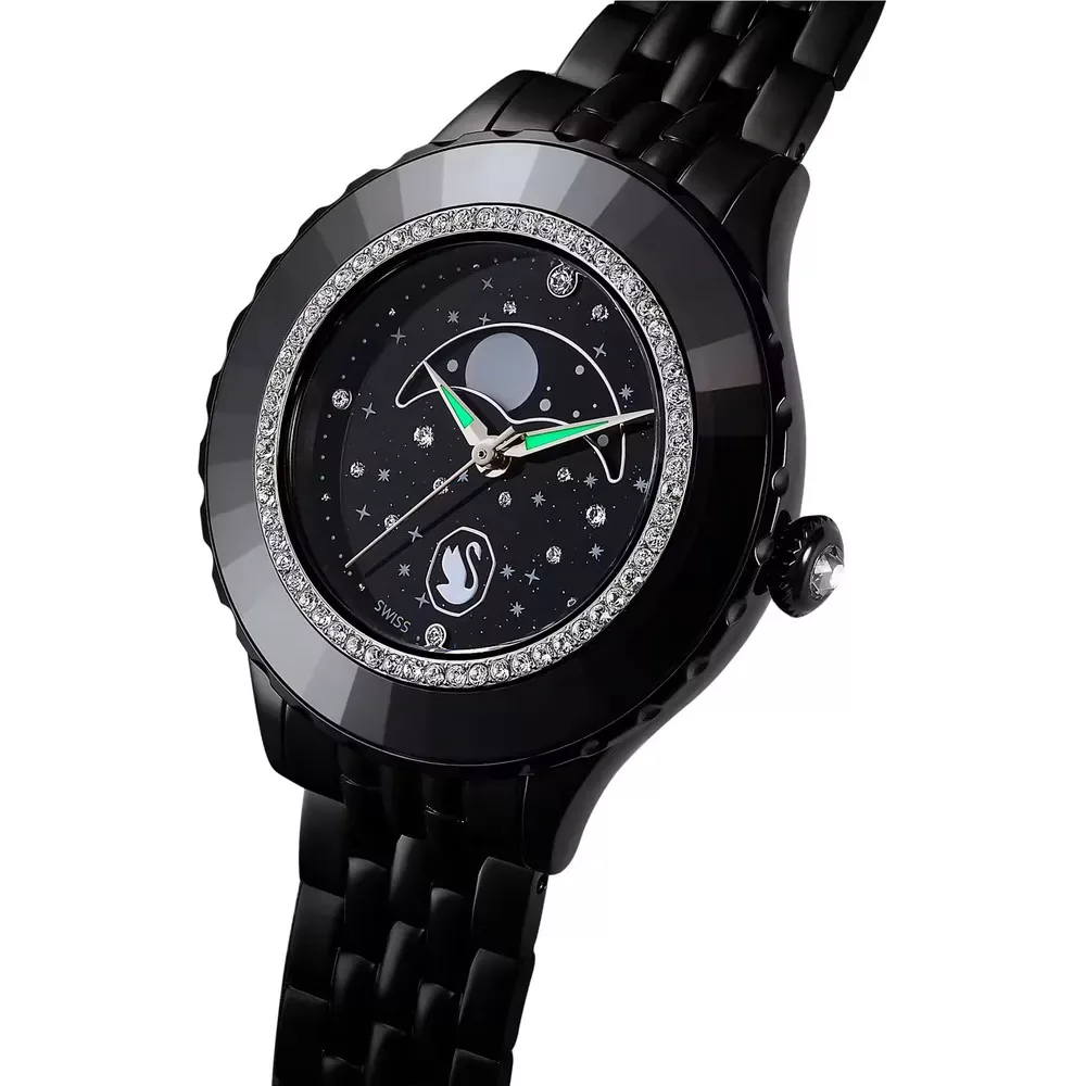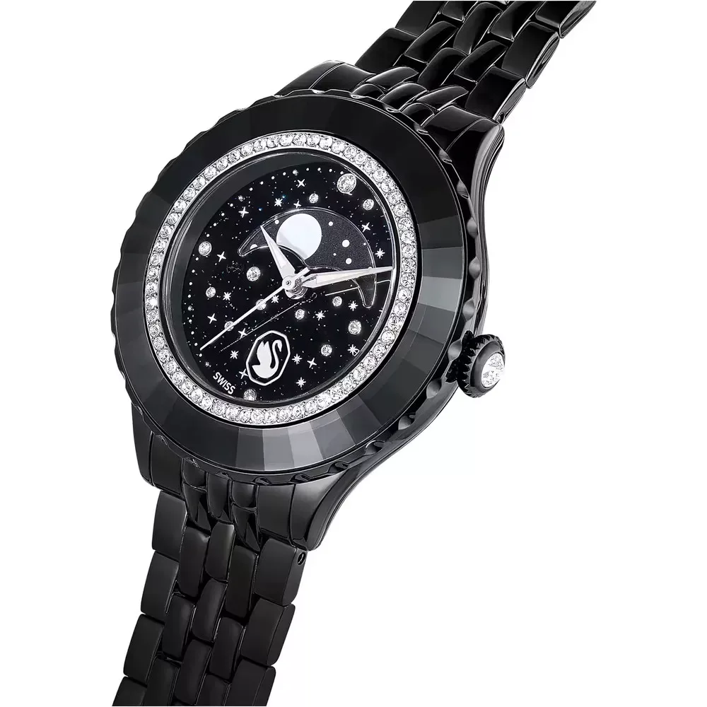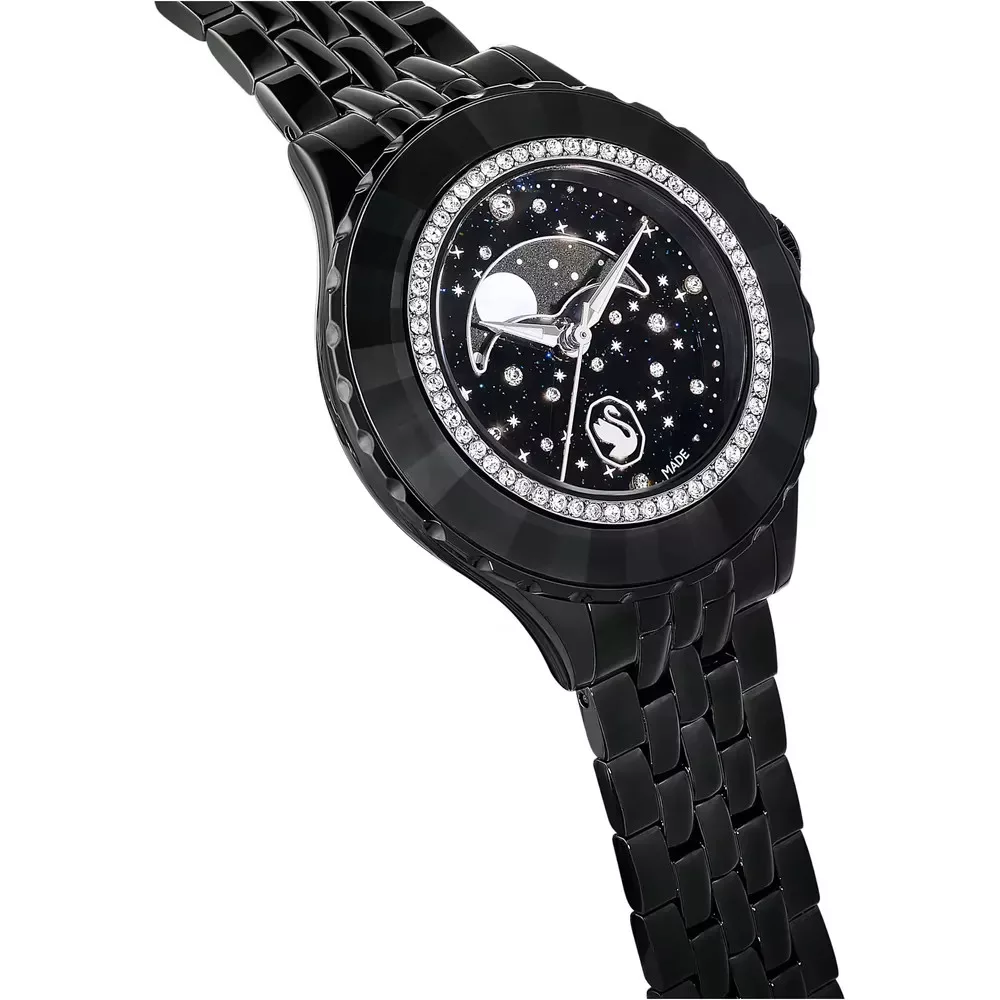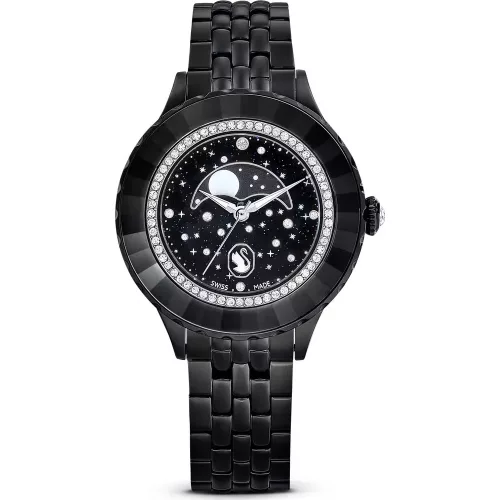 Swarovski Octea Moon női karóra fekete PVD fém szíjjal, holdfázis funkcióval és pavé kristályos lünettával. Svájci kvarc szerkezet, vízálló. Cikkszám: 5677497.