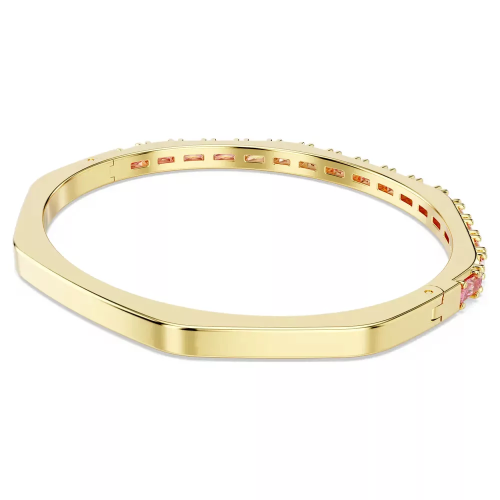 A Swarovski 5705791 cikkszámú Matrix csuklópánt ragyogó megjelenést kölcsönöz: az ikonikus nyolcszög forma arany tónusú PVD bevonattal és a horizontálisan elrendezett rózsaszín baguette cut Swarovski cirkóniák finom csillogásával.