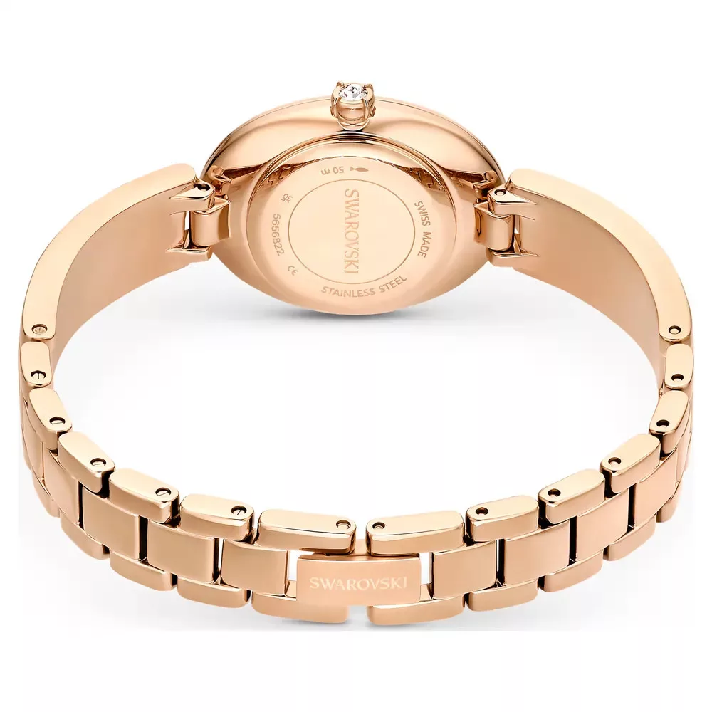 A Swarovski Crystal Rock Oval 5656822 karóra a női elegancia és csillogó részletek páratlan kombinációját kínálja. A 26 × 29 mm méretű, ovális rozéarany tónusú PVD bevonatú tok finoman kiemeli a napsugár kék számlapot, amelyen a Swarovski hattyú logó díszíti a 12 órát — minden megjelenést kifinomult eleganciával gazdagít.