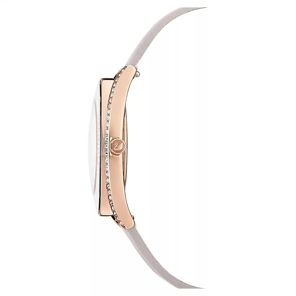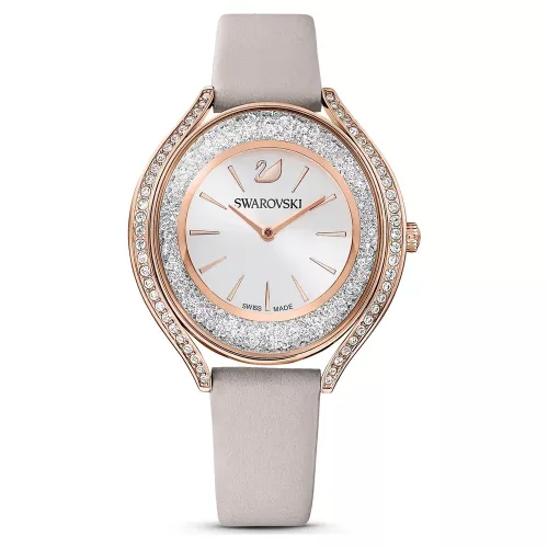 Swarovski Crystalline Aura 5519450 női karóra svájci kvarc szerkezettel, több mint 1300 kristállyal díszített rózsaarany PVD tokkal és szürke bőrszíjjal — elegáns, ragyogó kiegészítő.