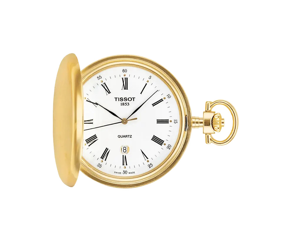 A Tissot Savonnette T83.4.553.13 klasszikus svájci zsebóra 48,5 mm tok, arany PVD bevonatú acél ház, fehér számlap, római számokkal és Swiss Quartz szerkezettel.