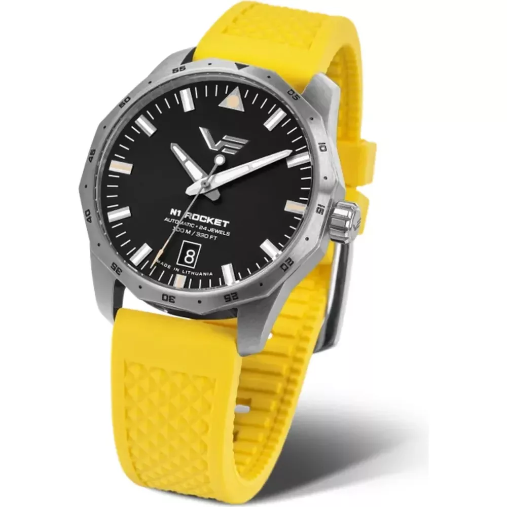 A Vostok Europe NH35-125A747-SY N-1 Rocket Compact modell a Rocket N-1 sorozat kompakt, karakteres élményét kínálja: 39 mm átmérőjű rozsdamentes acél tok és feltűnő citromsárga kaucsuk szíj kombinációja stílusos és dinamikus.