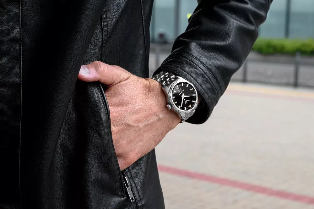 A 10 ATM / 100 méteres vízállóság és csavaros korona + hátlap növeli a tartósságot, így úszásra is alkalmas. A robustus méretezés (kb. 14 mm vastagság, ~90 g) erőteljes, ám még viselhető marad.