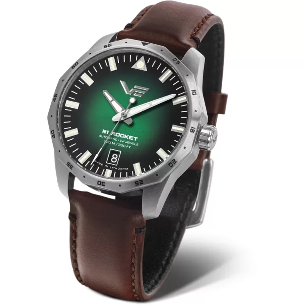 A Vostok Europe NH35-125A749-L N-1 Rocket Compact modell a Rocket N-1 sorozat kifinomult változata: élénk zöld számlap barátságos barna bőr szíjjal, amely klasszikus eleganciát ad sportos automata mozgatással.